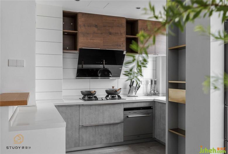 開放式廚房寬敞明亮,采光充?,U形廚房臺?將可操作空間最?化,做舊質(zhì)感的灰色與胡桃??膽的糅合在?起,現(xiàn)代與傳統(tǒng)的碰撞使空間層次更加豐富精致。
