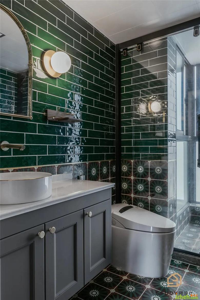 衛(wèi)生間沿襲了外部的氛圍,復(fù)古質(zhì)感低調(diào)流露,拱形銅鏡精致的線條,金色光澤克制而優(yōu)雅,鏡前燈柔和的光影間,收獲你笑起來的模樣。