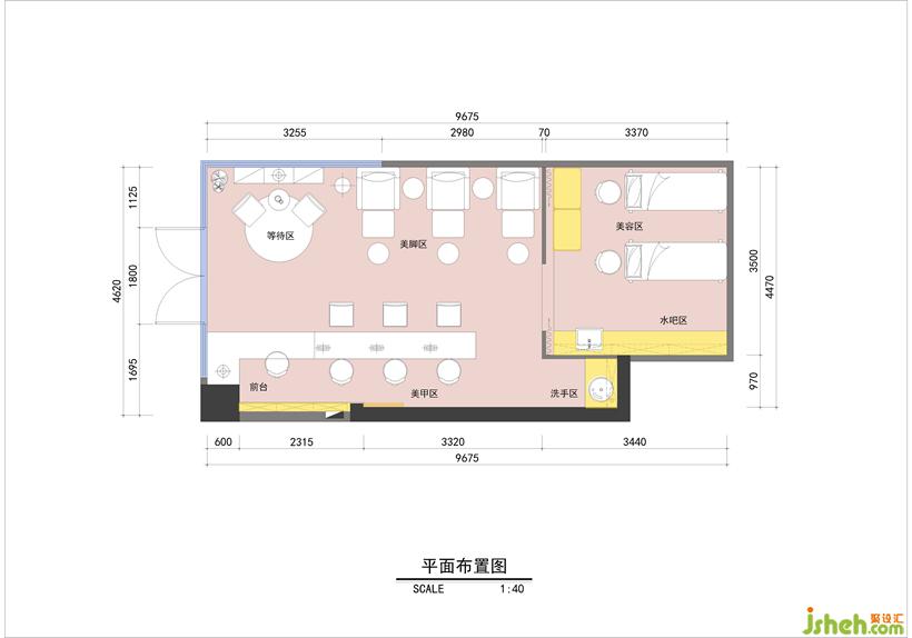 在42平的使用面積里,要同時(shí)保留開放,與私密區(qū)域的規(guī)劃,開放區(qū)必須容納完善的功能,要為等位的顧客設(shè)置的等待區(qū),要準(zhǔn)備舒適的尺度給美腳區(qū)域,方便美容師的操作。內(nèi)外都設(shè)置盥洗區(qū),使用空間互干擾。美甲桌結(jié)合吧臺(tái)一排拉通,小空間也能呈現(xiàn)出大器的空間體驗(yàn)。