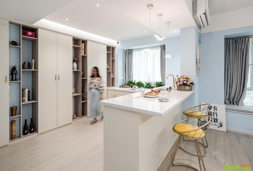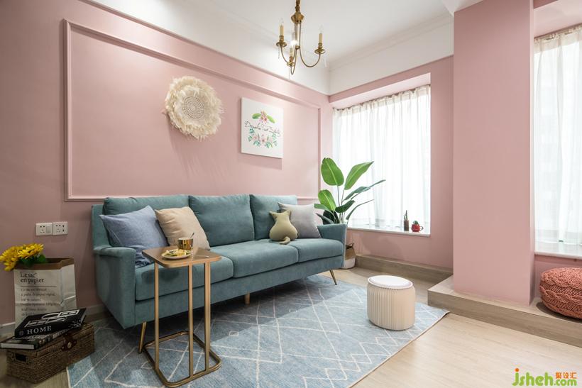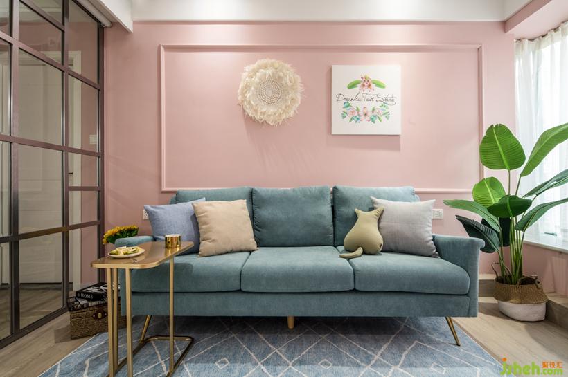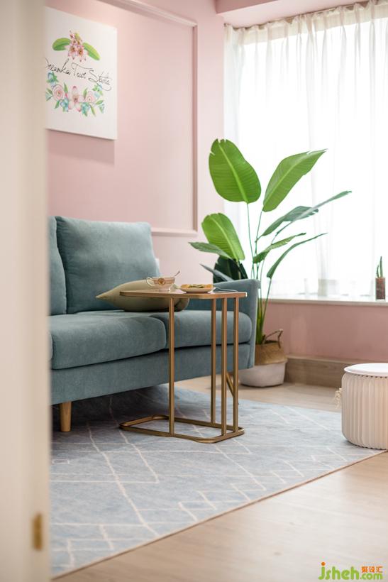 由于前業(yè)主改動衛(wèi)生間的位置,只能通過走明管來解決。地面抬高區(qū)為管道位,買沙發(fā)的時候特意選購沙發(fā)椅背傾斜的造型,能夠完美的貼合墻壁。柱子旁正好留出空位放一個矮墩。