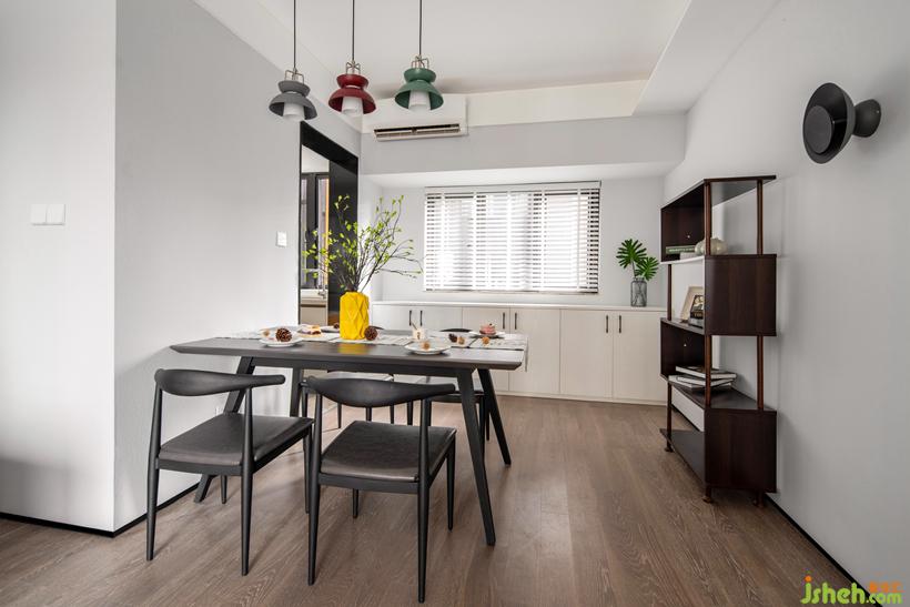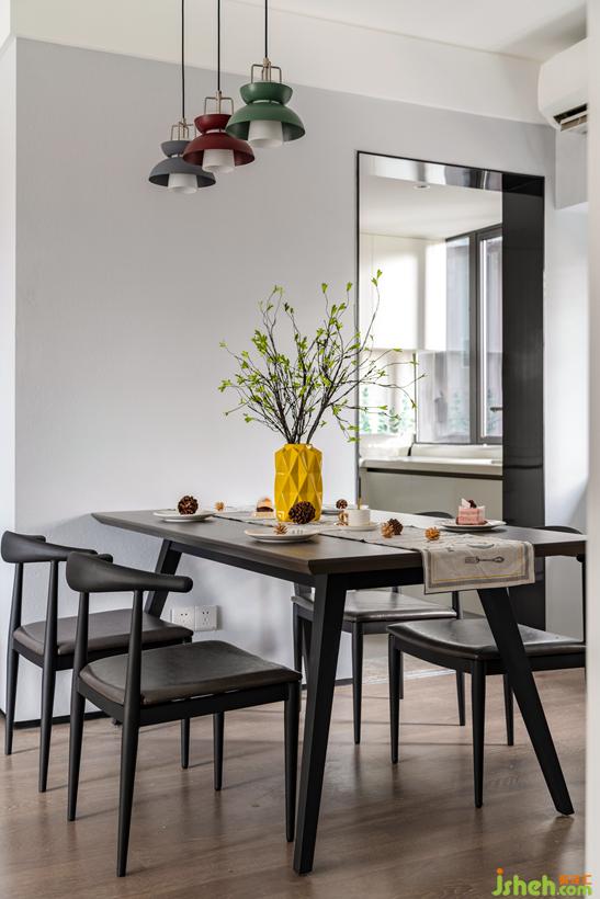 墻面黑色的壁燈, 與鐵制餐桌椅。給無(wú)力感的灰色增加一些重量。