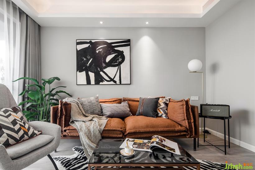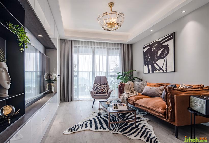 用灰色調和房間的基調,一種高級感在空間展開。將電視柜設定為弱勢方,沙發(fā)區(qū)作為強勢方著重表達。掛畫與地毯相呼應,從圖片上迸發(fā)出一種視覺張力。