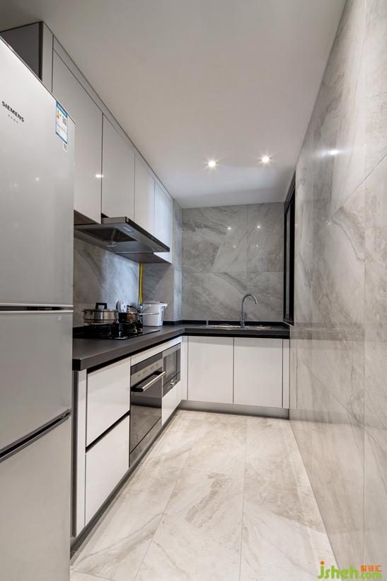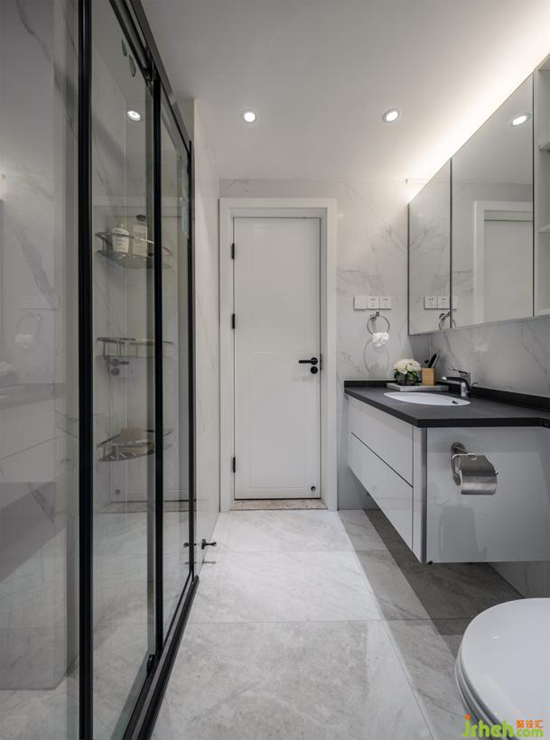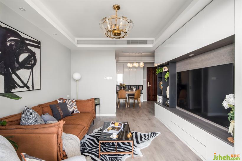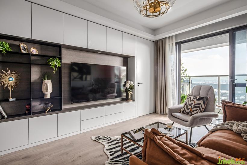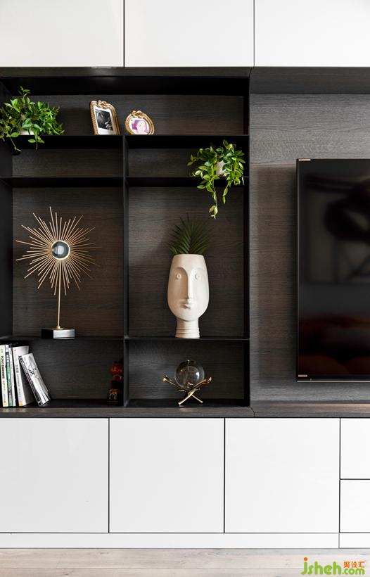 電視柜整合主臥門與設(shè)備,一路延伸轉(zhuǎn)至玄關(guān)處,空間體量無限放大。