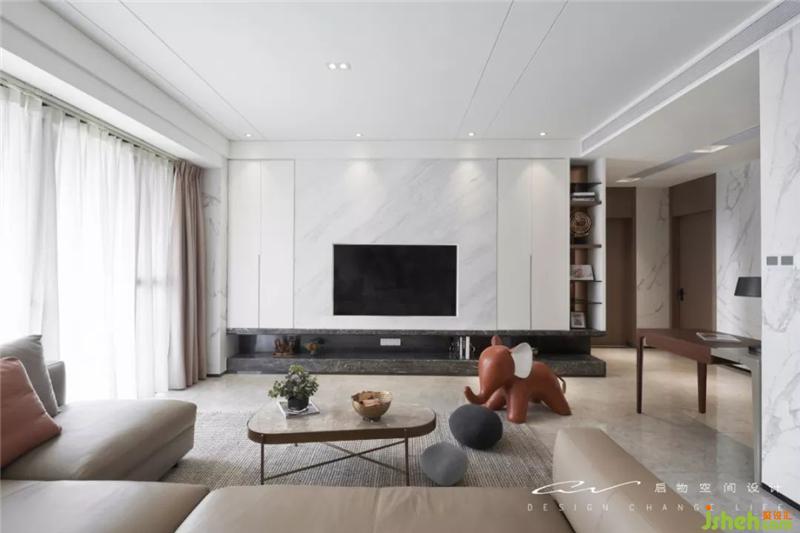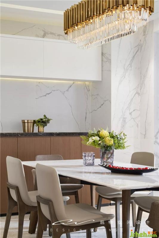 電視墻對(duì)稱的設(shè)計(jì)更顯莊重,挑空的柜體帶來輕盈感。石材與不銹鋼的收邊是力量,側(cè)邊茶灰鏡帶來通透感。裝修設(shè)計(jì)