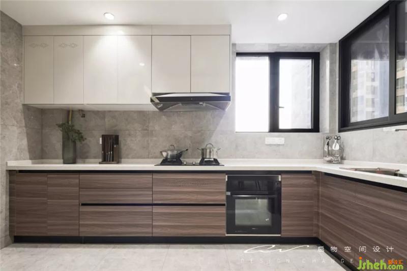 原廚房僅有的一扇窗戶,不足以支撐大廚房的采光。我們將與陽臺(tái)接壤的墻面重新開拓出新窗。才得到現(xiàn)在的明亮感,木色的橫紋與黑色元素帶出硬朗的極簡氛圍。右側(cè)冰箱還未入場(chǎng)。