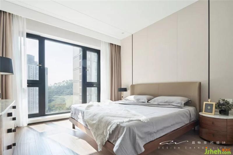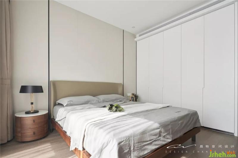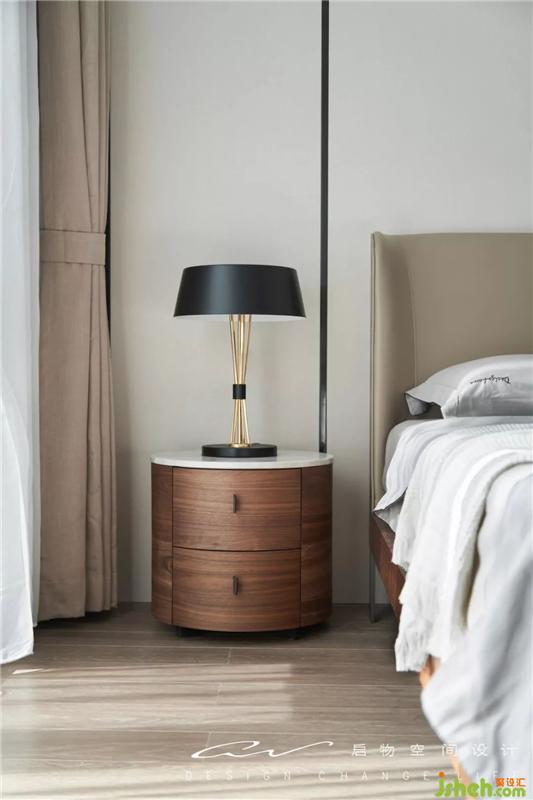 在塊面與線條中,用一點(diǎn)床頭柜的圓活潑主臥空間。
