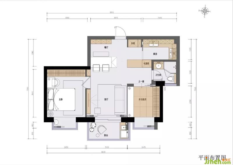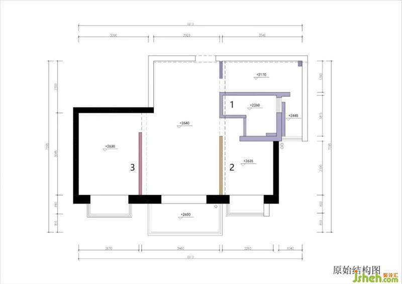 粉色區(qū):這堵墻很尷尬。擠到了主臥,切散了客餐廳,留下奇怪的凸角。裝修設計