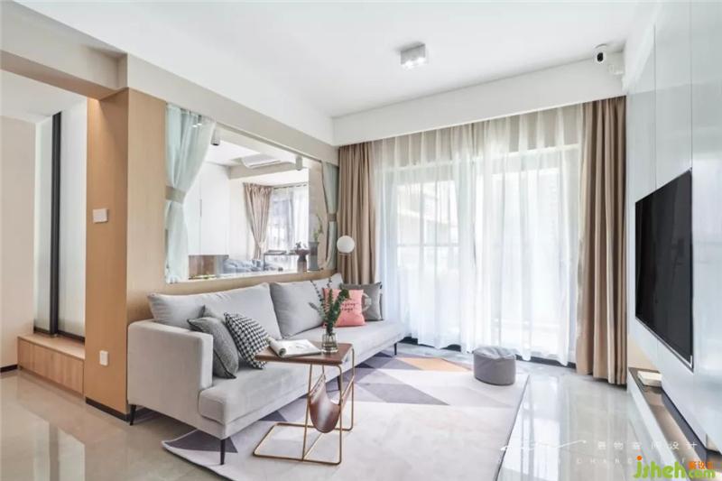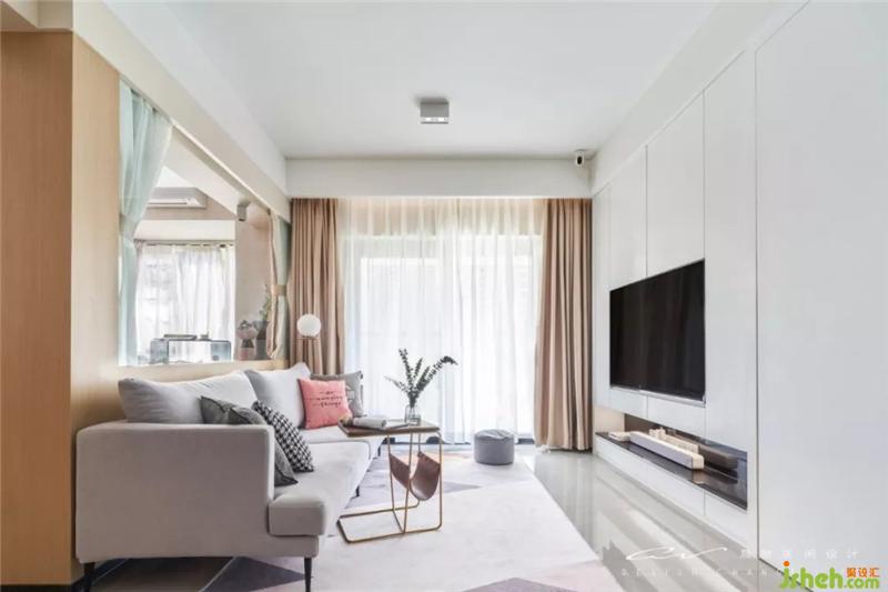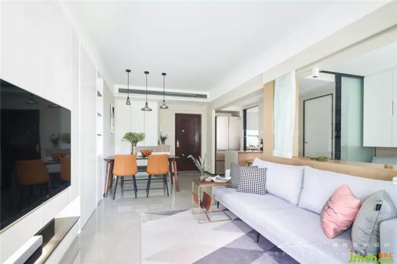 沙發(fā)挑了很久才找到尺寸剛剛好的,灰色的布料,串聯(lián)地毯的灰調,再用一塊粉色妝點活潑。裝修設計