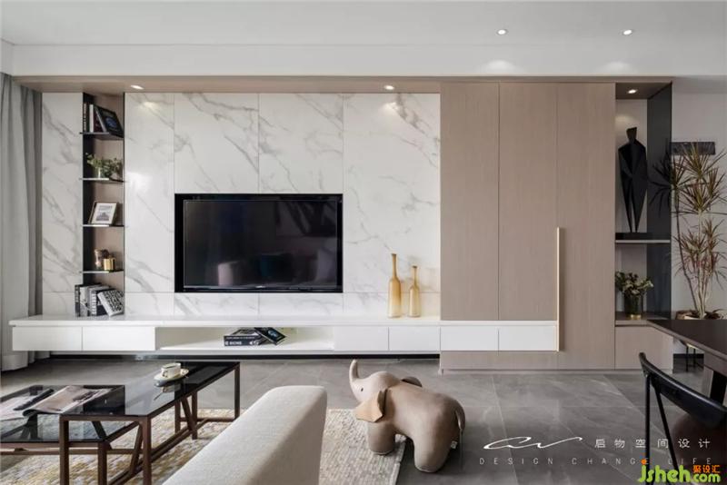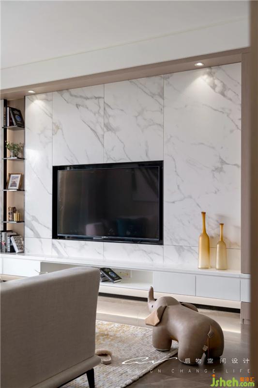 把電視墻看成白色塊面與木色塊面的穿插關(guān)系。借由白色挑空電視柜插入木色柜,木色從天花延展向下鋪滿層板架而止。