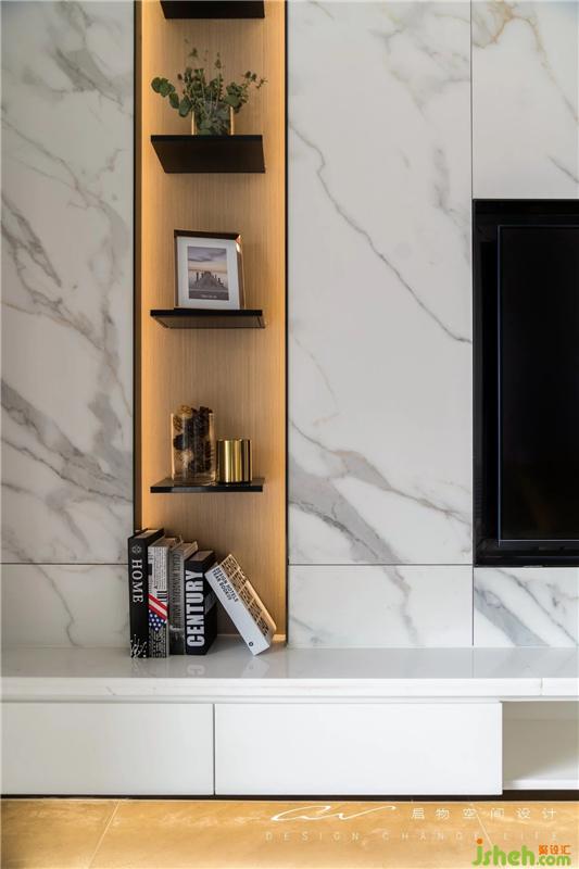 既是順應(yīng)展示需求,層板架就做到足夠精致。黑色不銹鋼將石材收邊,燈帶下的木飾面漸氳,不搶眼的烘托出玄挑層架上的小物。
