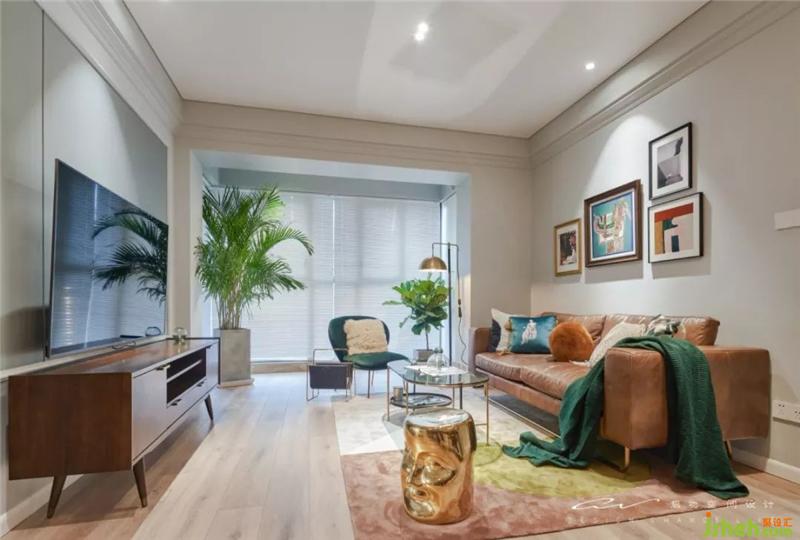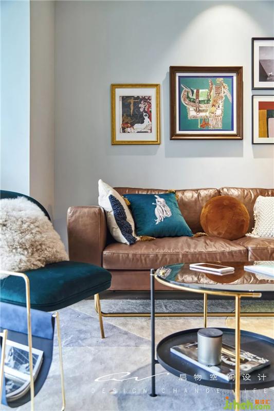灰色墻面和淺色地板為基調(diào),墨綠色的邊椅和姜黃色的地毯為點(diǎn)綴。 茶幾玻璃通透,掛畫復(fù)古別致,再加點(diǎn)金屬的元素,交織復(fù)古西洋風(fēng)的氣質(zhì)。裝修設(shè)計(jì)