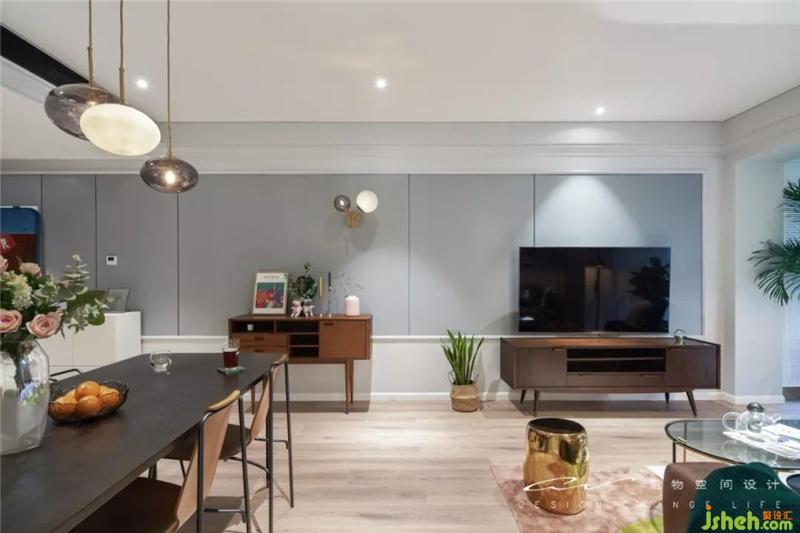 墻面線框區(qū)隔兩種灰度、兩種味道 。留縫線條像音樂的節(jié)奏、深深淺淺。墻漆直接刷過天花線條,顯層高,也更整體。