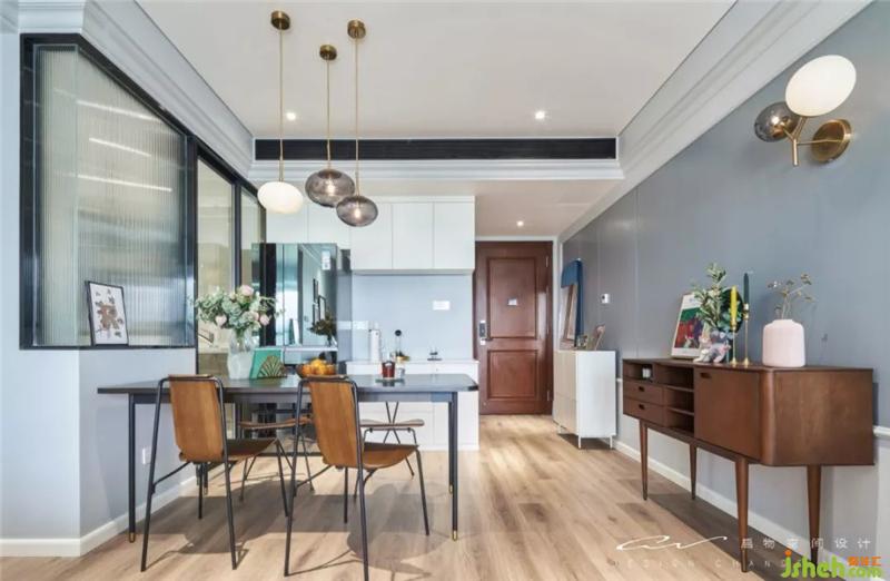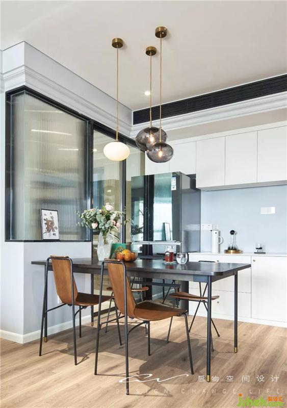 廚房用長(zhǎng)虹玻璃和推拉門的組合,讓餐廳通透的同時(shí),也隔絕油煙。