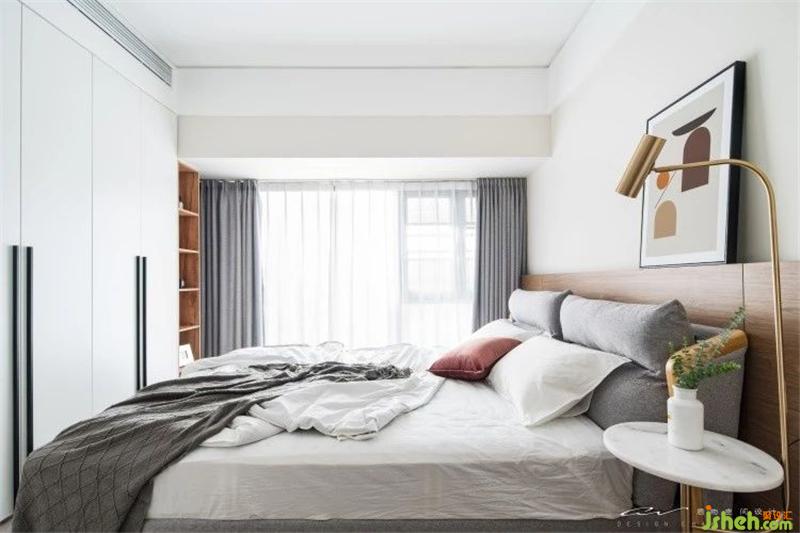 主臥的衣柜做足,窗下開(kāi)放格收納小件物品。