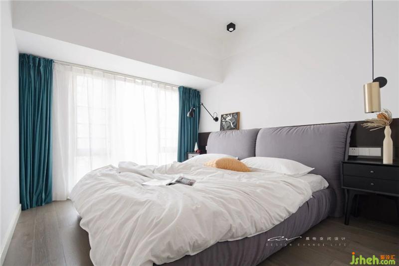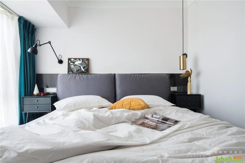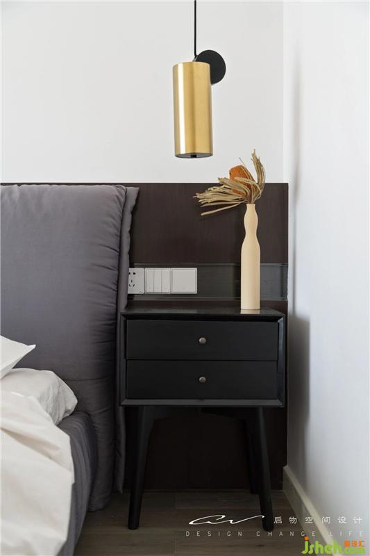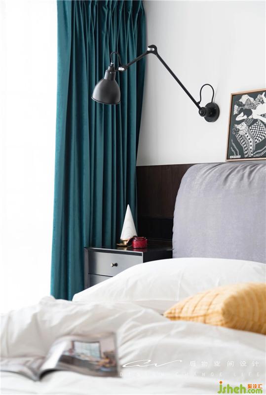 暗黑的色系延續(xù)到主臥 床背貼木皮上了亮光漆 床頭燈款式不一 是隨性的美感