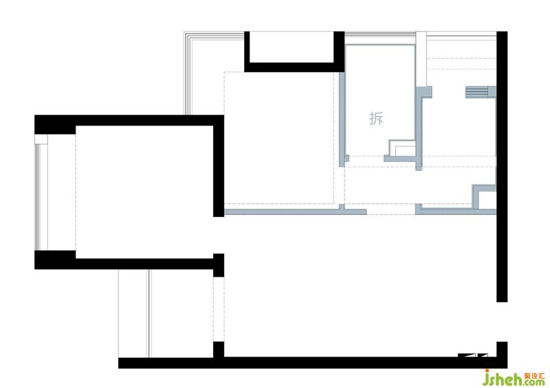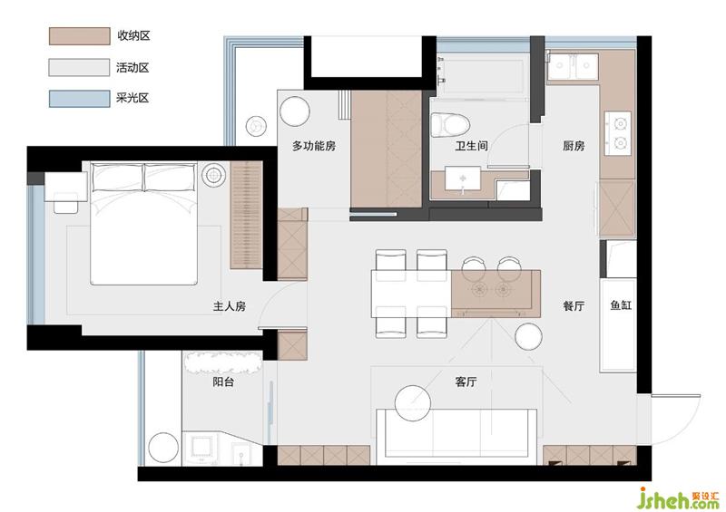 重新規(guī)劃后如圖,整個(gè)案例的思路是: 1.(敲重點(diǎn)?。┯霉褡觼?lái)形塑空間。2.(敲亮點(diǎn)?。┛筒蛷d非常規(guī)的布局。消滅了純過(guò)道。