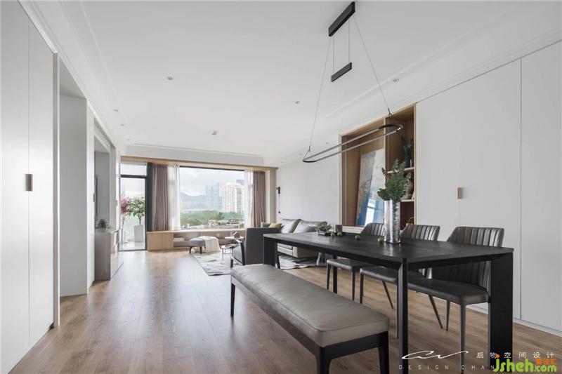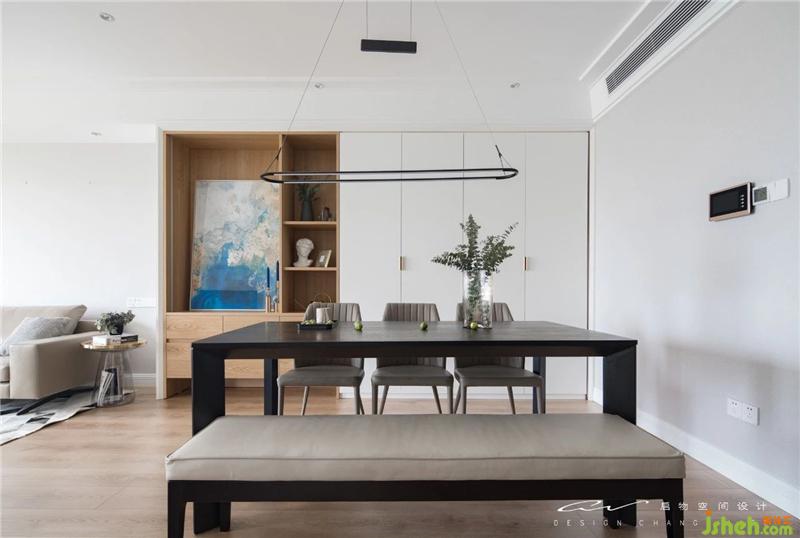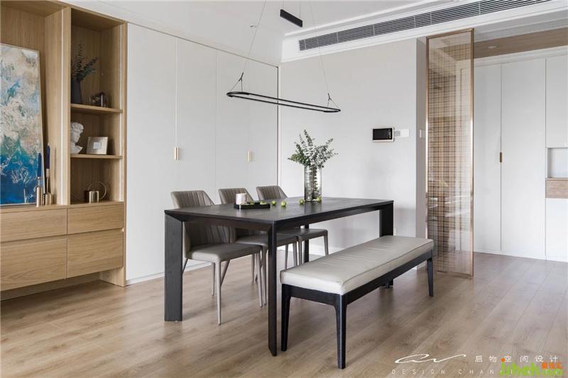 吊燈造型簡潔,高度不依賴電工師傅,可以手動調(diào)節(jié)。餐邊柜輔助餐桌收納,展示小物件。裝修設(shè)計