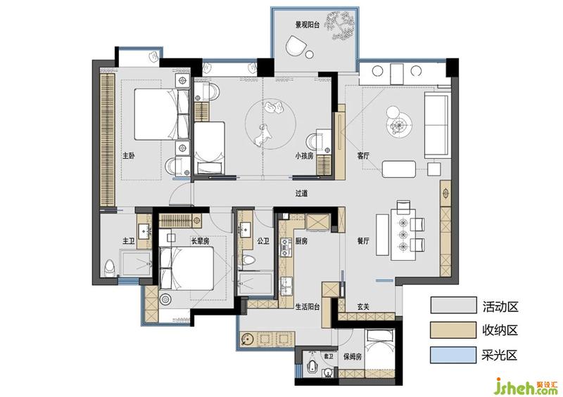 首先:啟物把客廳、小孩房、主臥、按照觀景的角度設(shè)計。
