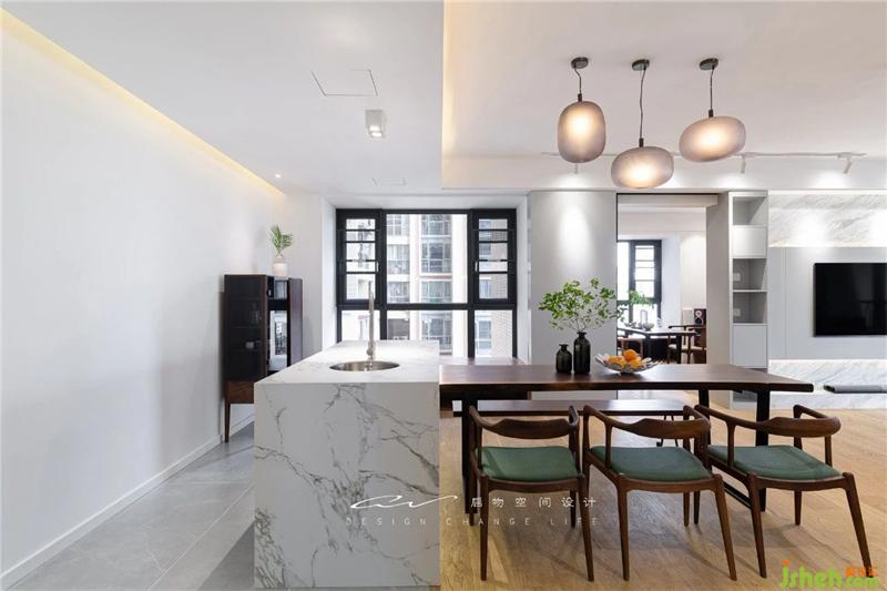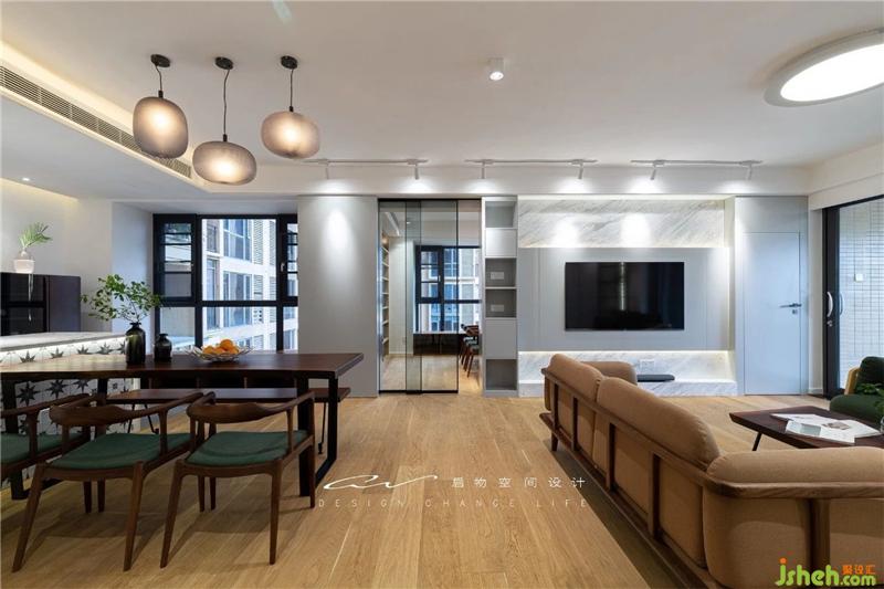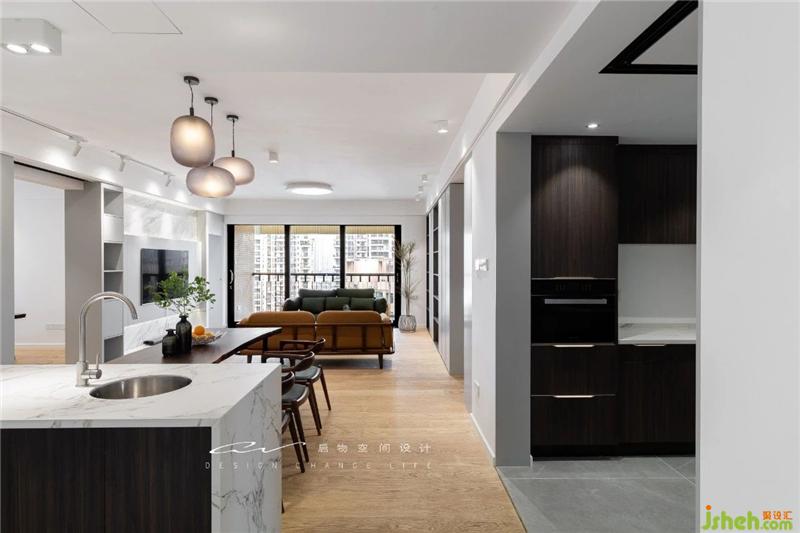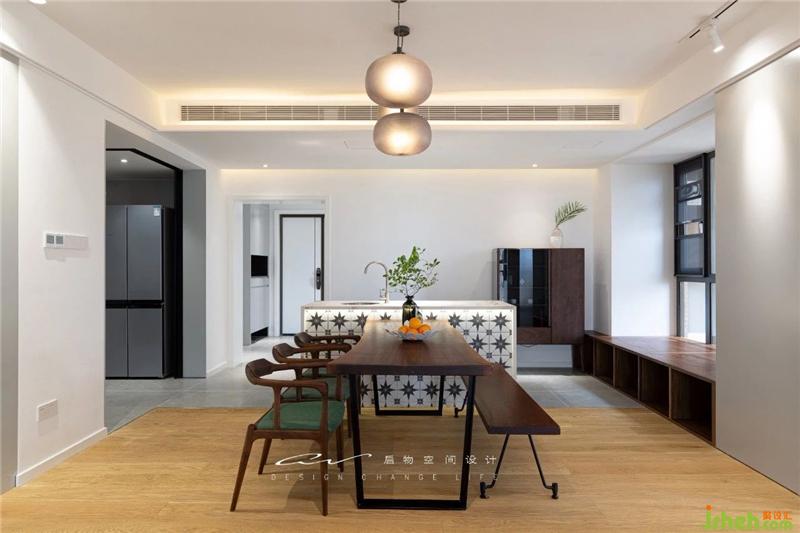 再退一點(diǎn),看到木地板和地磚隱形分割了餐廳和廚房,打掉飄窗,造飄窗柜,又多一處巧妙的收納。裝修設(shè)計(jì)