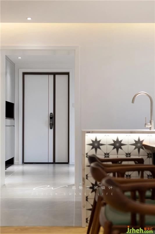 黑白色大門簡(jiǎn)潔,左邊是鞋柜及小房間,右邊是健身房。