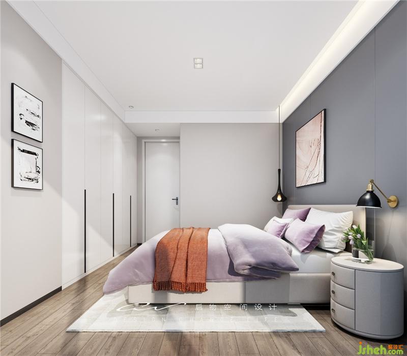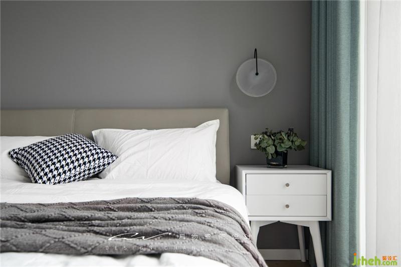 效果圖對(duì)比:深灰色的床頭背景體現(xiàn)了王小姐沉穩(wěn)內(nèi)斂的性格,搭配了些許布藝的色彩點(diǎn)綴,讓空間不再單調(diào)。裝修設(shè)計(jì)