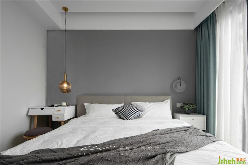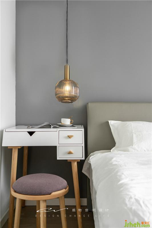 臥室床頭配了MINI梳妝臺(tái)。一個(gè)金屬質(zhì)感的吊燈,搭配一個(gè)黑桿玻璃壁燈個(gè)性又時(shí)尚!
