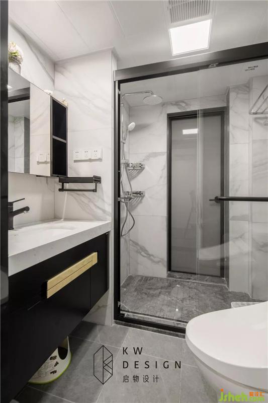 衛(wèi)生間黑白的配色整潔,這里往外就是生活陽臺了,一扇磨砂玻璃門隔絕了凌亂。裝修設(shè)計