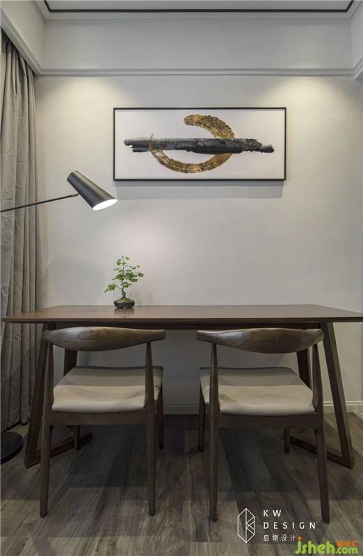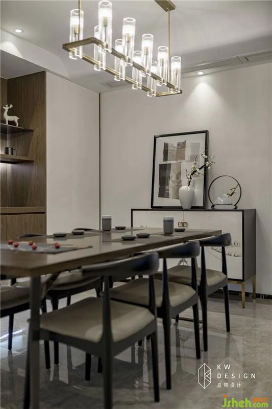 胡桃木餐桌,黑色和米灰色交織的椅子顏色之間的碰撞,層次豐富,布局從容,相互表達(dá)出敬意。令人溫暖的燈光,仿佛在等待家人的回歸。室內(nèi)設(shè)計(jì)師
