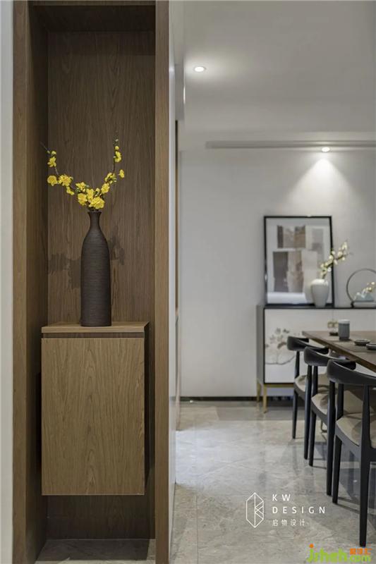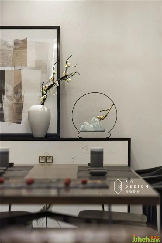 這種基調(diào)延伸到餐廳,將收納柜的側(cè)邊設(shè)計(jì)成展示柜,現(xiàn)代和古典氣質(zhì)交織融為一體,心中開始涌動(dòng)起了詩意,有了想敘事的心思,也便有了停頓和思考。