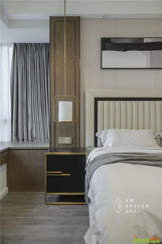 窗外投射進(jìn)來的陽光沐浴著帶有生活本質(zhì)的墻布和沉積著厚重歷史感的深灰色的木地板,奶茶色的硬包,在做工精湛,充盈生命力度的線條下,訴說著對嶄新生活的期待,對未來的無限向往。
