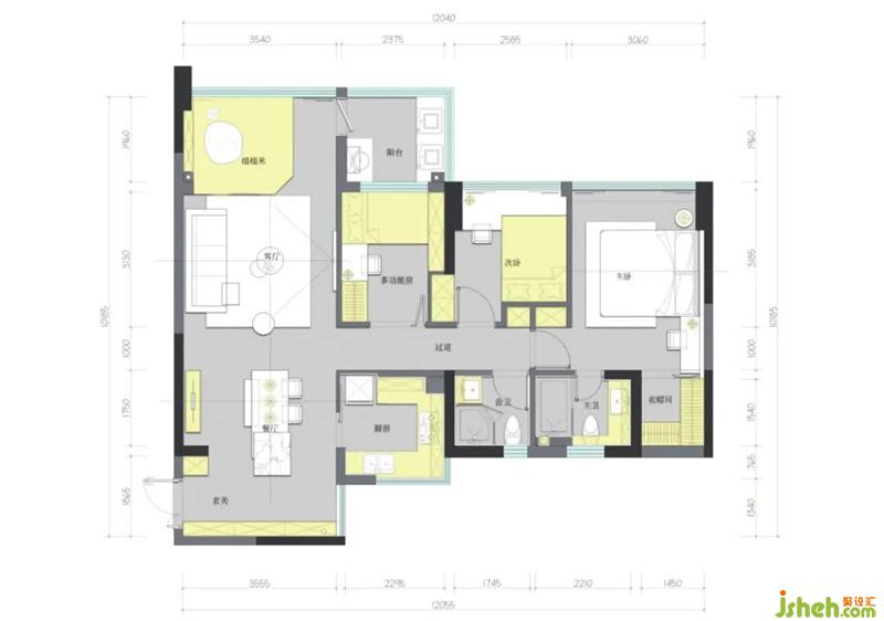 原始的屋況能看出:進(jìn)門(mén)的鞋柜位置太小,陽(yáng)臺(tái)有地梁分離了客廳和陽(yáng)臺(tái)的連通性,廚房利用率低,主臥室收納不足。