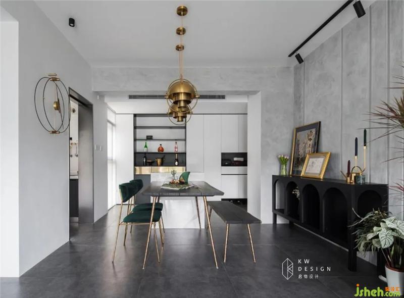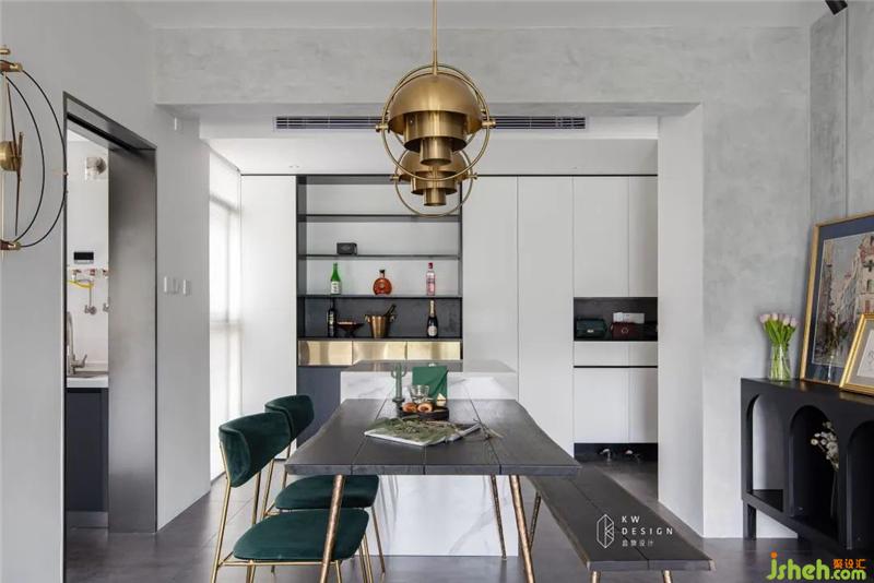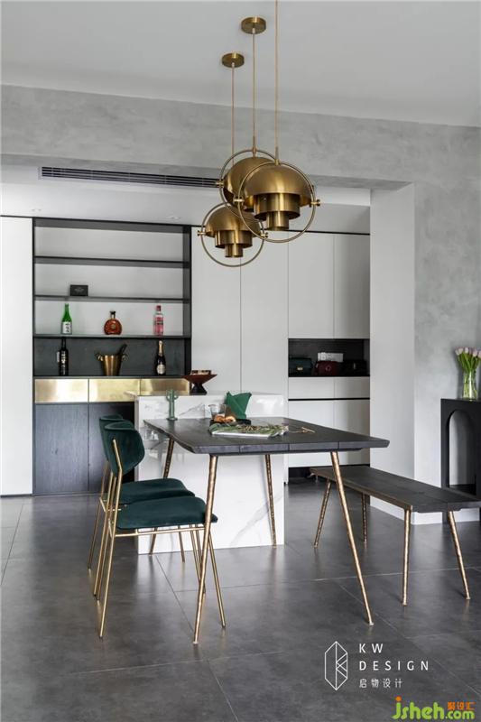 墨綠色的餐椅,能在空間中形成視覺(jué)焦點(diǎn),而黃銅質(zhì)感的吊燈,在視覺(jué)上可以形成一股極強(qiáng)的視覺(jué)張力,低調(diào)的黑色餐桌很好的過(guò)度并降低了空間的奢華感,讓溫馨的用餐時(shí)光更有儀式感。