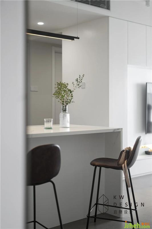 進(jìn)口的雪花白巖板臺(tái)面突顯屋主的高生活品質(zhì),粗細(xì)不一的脈絡(luò)透過(guò)大理石純白底色背景,散發(fā)出一種高貴氣質(zhì),空白處透露出一種清新色調(diào)和誘人品質(zhì)。特別定制的咖色皮質(zhì)吧臺(tái)椅高度滿(mǎn)足屋主辦公,會(huì)餐,休閑,洽談等功能。裝修設(shè)計(jì)