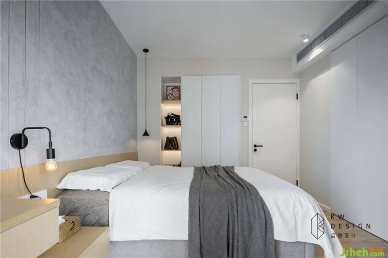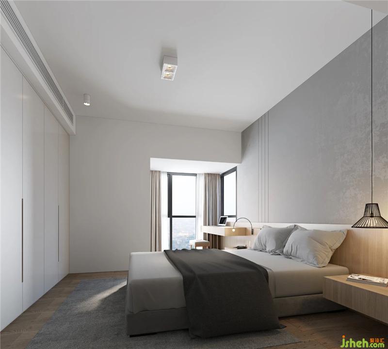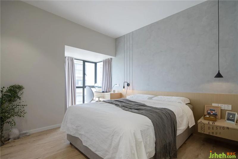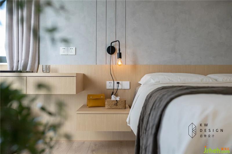 木材的延伸從儲(chǔ)物柜下方的抽屜到床頭柜到床頭背景到書(shū)桌,讓空間連貫擴(kuò)張,同時(shí)弱化窗邊橫梁結(jié)構(gòu)。挑空的床頭柜和書(shū)桌,展現(xiàn)了對(duì)稱(chēng)均衡的視覺(jué)美感,整個(gè)空間輕盈活潑。裝修設(shè)計(jì)