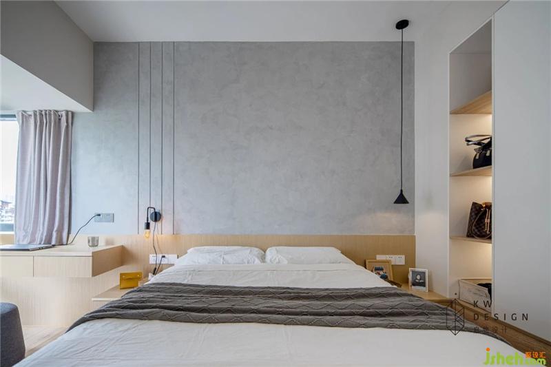 理性的男屋主和感性的女屋主性格不同卻又有著相同愛(ài)好特點(diǎn)。統(tǒng)一與對(duì)比的關(guān)系在空間中同樣需要處理和呈現(xiàn)。主臥空間的冷暖對(duì)比,通過(guò)材質(zhì)的體現(xiàn)協(xié)調(diào)統(tǒng)一。整面的水泥灰藝術(shù)漆搭配細(xì)膩的黃楊木飾板,象牙白墻面搭配藕粉色棉麻窗簾,不同材質(zhì)肌理與顏色碰撞,個(gè)性而不失協(xié)調(diào)。