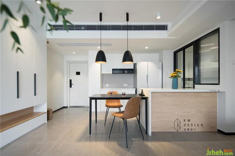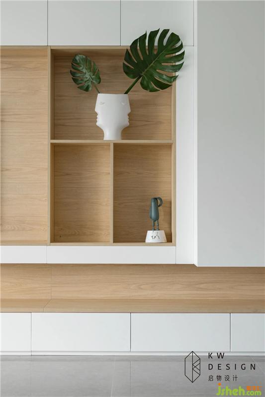 進(jìn)門(mén)左邊是到頂鞋柜與餐邊柜的結(jié)合,餐邊柜墻面刷了淺灰色乳膠漆做空間的功能區(qū)分,黑色開(kāi)放格增加了立面層次感。室內(nèi)設(shè)計(jì)師