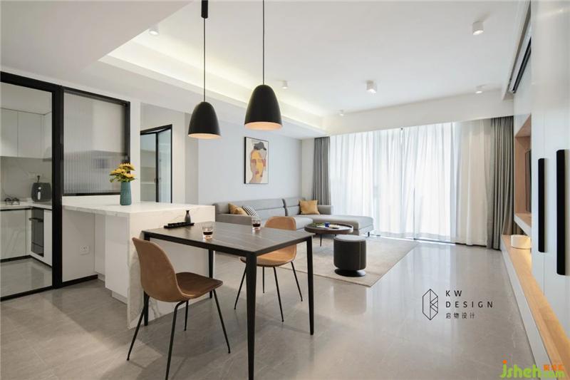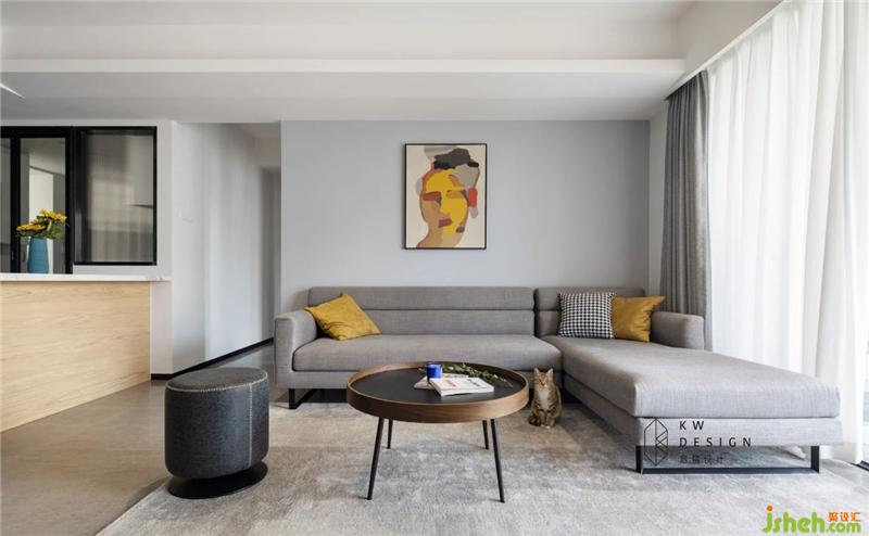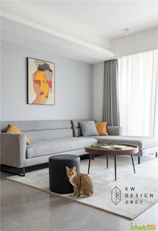 中性色彩有效沉淀空間情緒,各種質(zhì)感的灰,棉麻的,絨面的,織面的,搭配以淺藍(lán)色鋪陳的背景,抽象的藝術(shù)彩色掛畫(huà),為屋主提供了一個(gè)舒壓明亮的開(kāi)放空間。