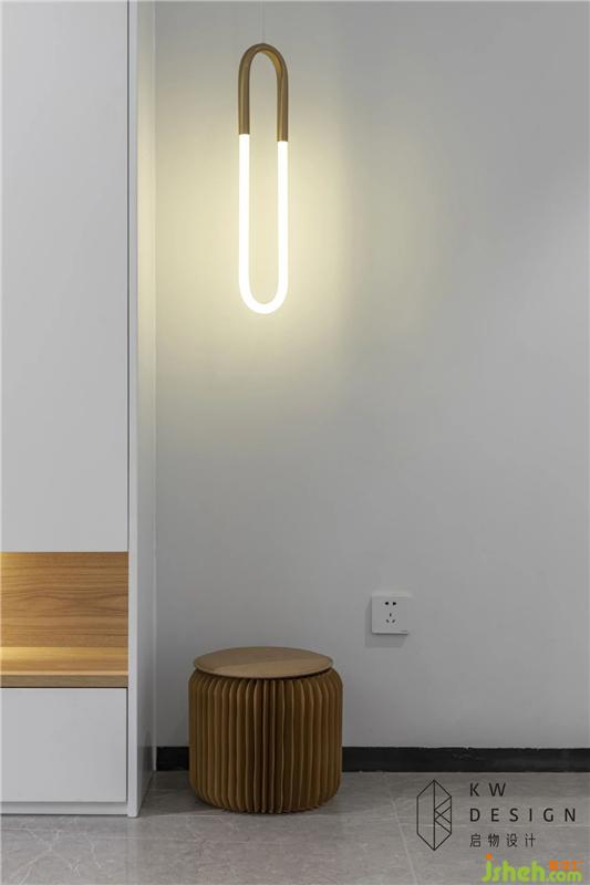 進(jìn)門(mén)處的牛皮折疊圓凳,U型創(chuàng)意吊燈,弱化了電視柜厚度,讓通透開(kāi)闊的休閑空間盡收眼底。