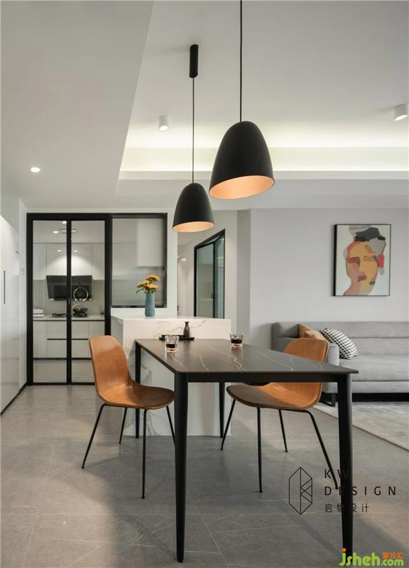 不規(guī)則灰色紋理的雪花白巖板吧臺(tái),和規(guī)則金色紋理的黑色巖板餐桌形成了強(qiáng)烈的視覺(jué)對(duì)比,棕色皮質(zhì)餐椅搭配簡(jiǎn)約黑色吊燈,為熱愛(ài)生活的主人提供一處滿足味蕾和觸覺(jué)的溫馨舒適小天地。室內(nèi)設(shè)計(jì)師