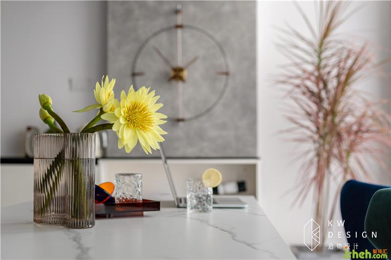 靠玄關的墻原本設計的是一整排柜子,防止壓抑改成了一排懸空的矮柜,簡單收納,室內設計師更多的會考慮美觀,裝飾的作用,巖板柜面,不僅高級還具備倒影的美感。