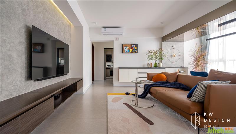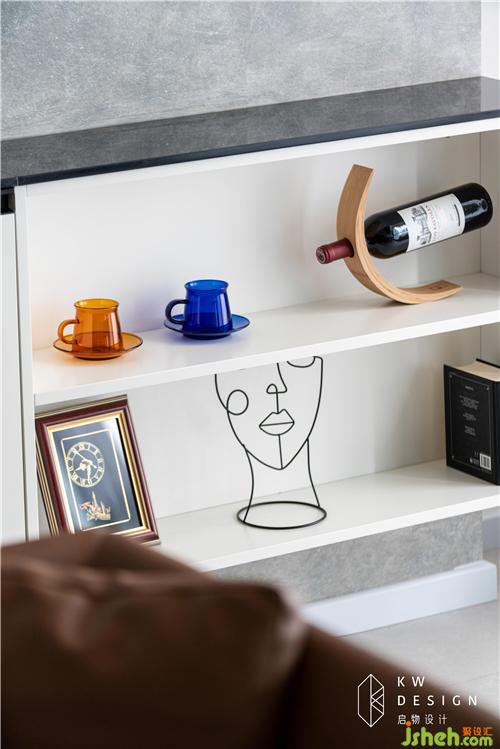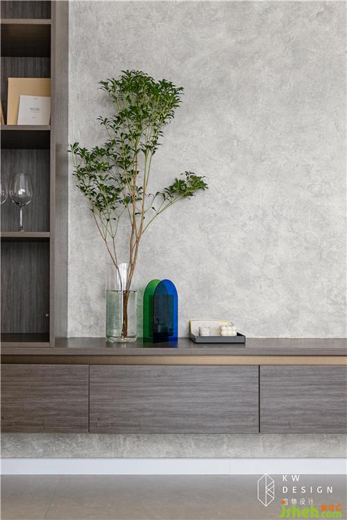 凹陷的電視背景視覺拉遠,給予舒適的視聽感受。電視位置進行了充分考慮,中線位置離地面一米左右。橫梁下煙熏灰的展示邊柜及電視底柜與藝術漆背景形成一個自然展示區(qū)域。