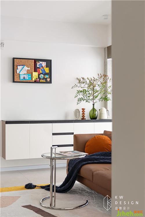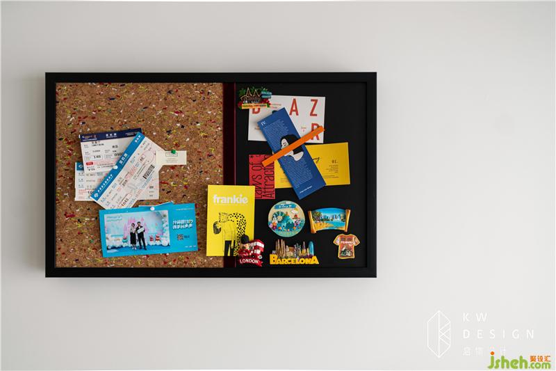 軟木板掛飾給整個空間添上了多彩吸睛的一筆,其后遮擋住了電表箱。日常釘上旅行后保留的機票,景點門票,明信片等,是家里溫情的一筆。忙碌的日常生活在這些美好回憶的存留下有了幾分生活明朗,萬物可愛,來日可期的意味。