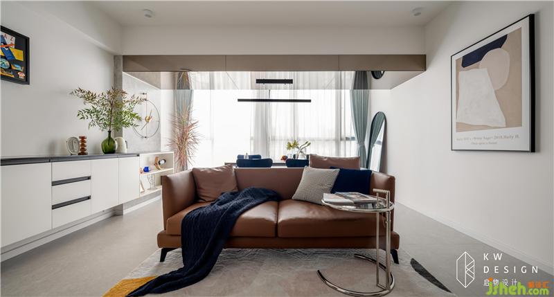 棕色沙發(fā)是客廳的重點色,餐廳配以寶藍色餐椅壓制平衡,靠近淺綠窗簾的餐椅換成墨綠色,考慮到后期靠窗再放置些植物可自然形成一個綠植角。