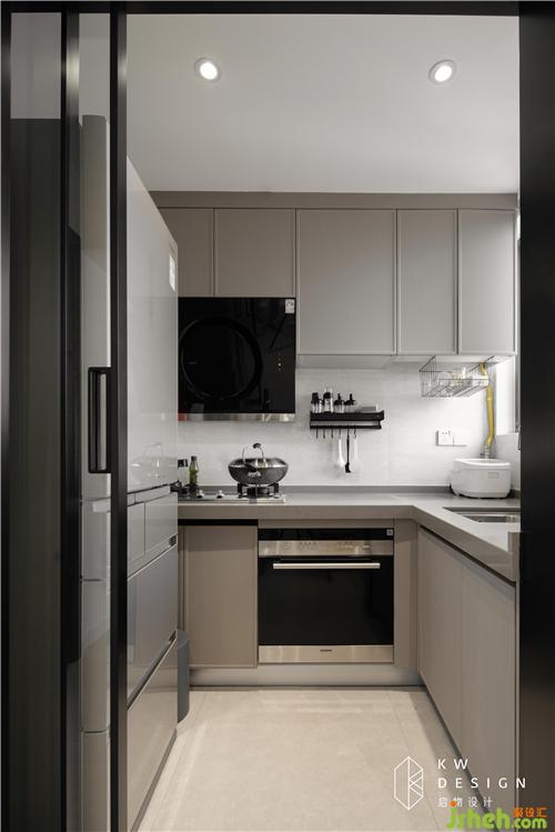 廚房門由原來的650mm擴(kuò)大為1090mm,改成玻璃推拉門,完善洗炒切功能,流暢動(dòng)線。小廚房也可以很方便。高級灰簡約大氣。