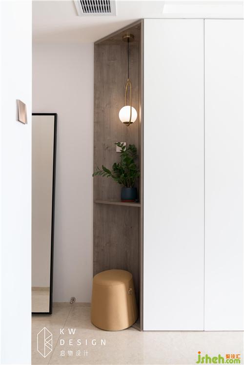 抬頭望一望墻柜的一端,早已改換成了端景柜:中灰色隔斷板層,內(nèi)置小小一盆綠植,金屬時(shí)尚掛燈靜靜灑下光芒。這是來(lái)自墻柜的溫柔。收納滿分的它也并不總是沉悶而無(wú)趣的。