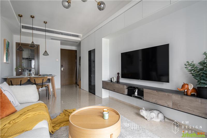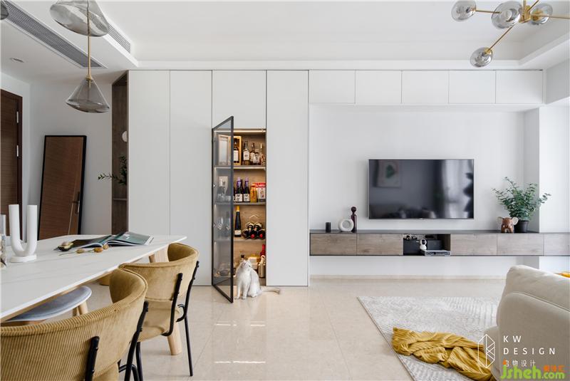 墻柜一直延伸至電視背景墻,增添視覺(jué)延伸性,電視柜往里推進(jìn),離沙發(fā)越遠(yuǎn),離視覺(jué)舒適越近。
