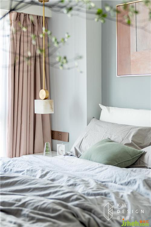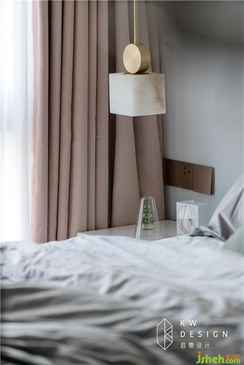 床頭柜這邊再增加一個幾何圖形的吊燈打破房間的沉悶:金與石,方與圓,冷與暖,直與曲。這是簡約不簡單的設(shè)計體現(xiàn)。