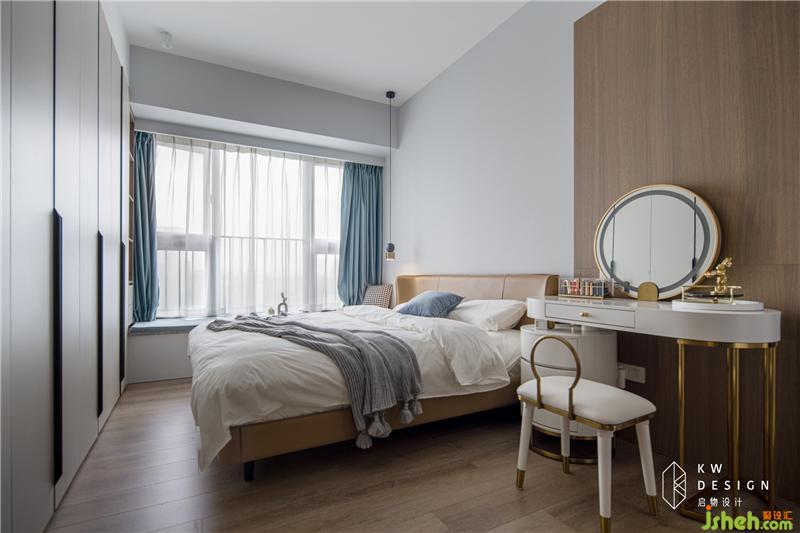 臥室整體偏簡(jiǎn)約溫馨。皮質(zhì)木色大床,搭配木質(zhì)墻柜,木式墻面從梳妝臺(tái)一直延伸至相鄰墻面,打造視覺延伸感,打破白色墻體的單調(diào)沉悶。