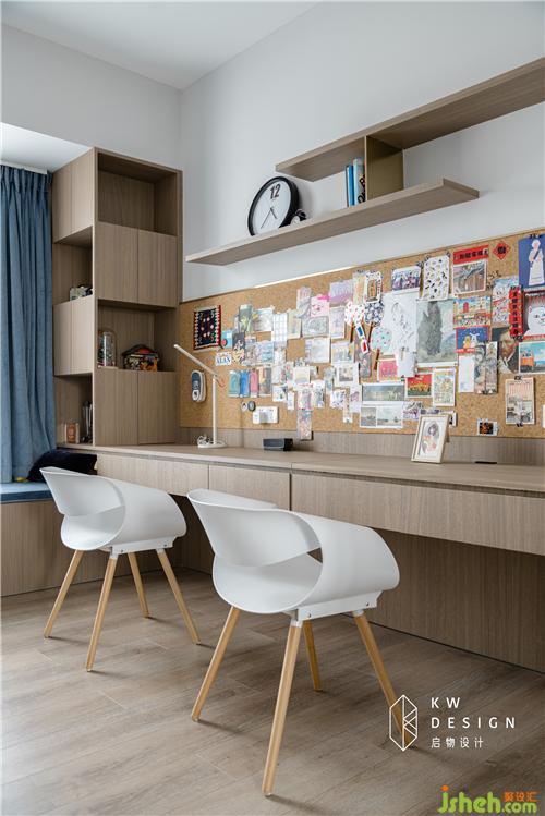 因?yàn)槟信飨矚g旅游和攝影。設(shè)計(jì)師特地設(shè)置了一個(gè)軟木板的墻面,可以用圖釘將大大小小的照片定格在墻面展示。無限組合,循環(huán)使用。