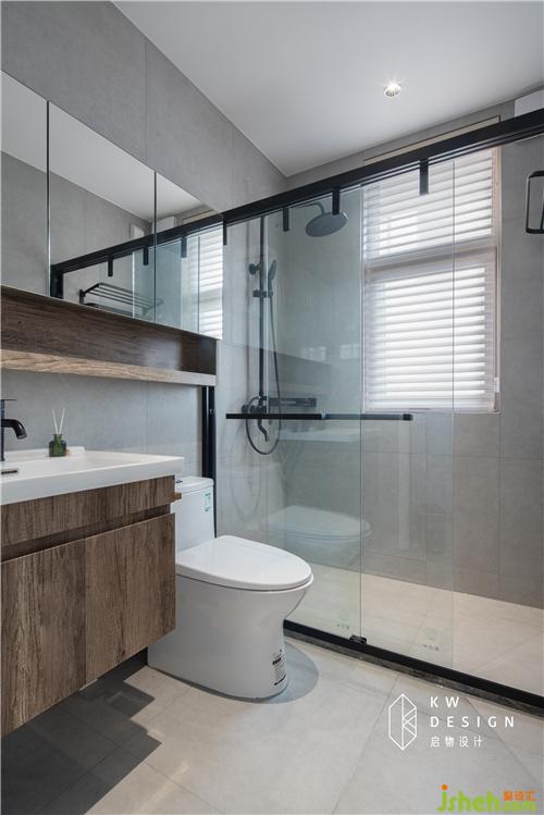 衛(wèi)生間干濕分離,整體整潔利落。同時(shí)采用木質(zhì)柜體,百葉窗,暖色照明燈等增添洗浴空間的溫馨放松之感。